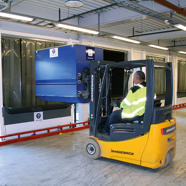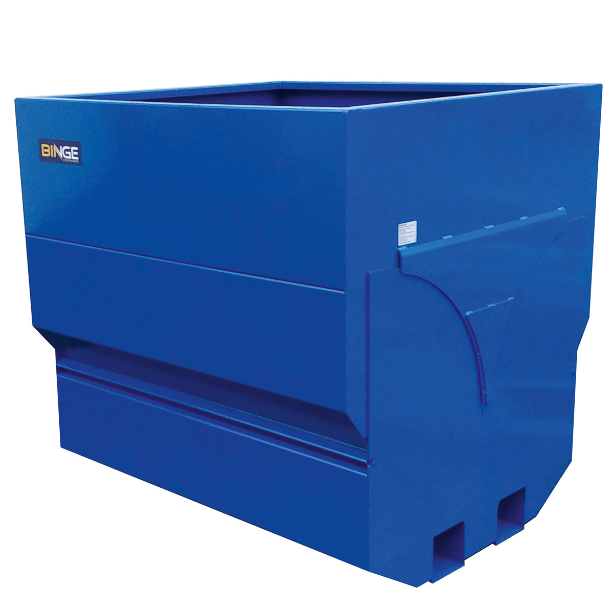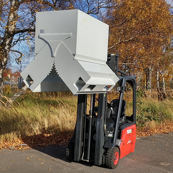 2600 liter. Tømming skjer ved at truckfører øker truckens gaffelavstand. Binge kan håndteres fra begge kortsidene.