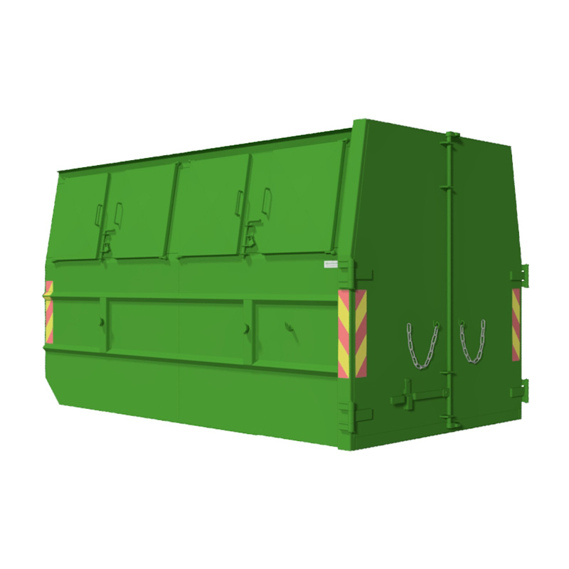 Liftcontaineren er beregnet for transport og tømming med liftbil. Containeren er beregnet for vanlig avfall. Vegger er utført med V-korrugerte plater. 2 store innkaståpninger på hver side med venstre- og høyrehengslet luker. Leveres med sidehengslet dører som er beregnet åpnet 180º under tømming. Luker og dører er låsbare. Alle hengsler kan og bør smøres.